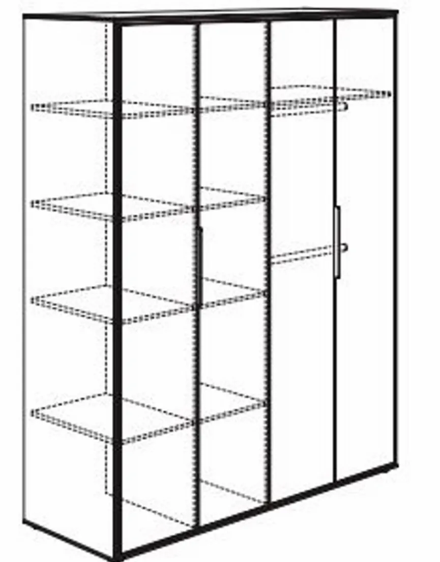- Mit 8 schmalen Einlegeböden links, rechts mit 1 breiten Einlegeboden und 2 Kleiderstangen