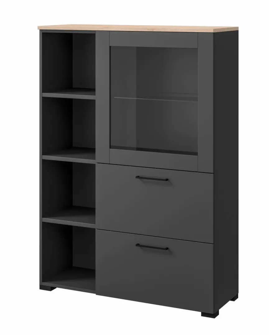 - Mit 1 Glastüre, 1 Glaseinlegeboden, 3 festen Fachböden und 2 Schubkästen