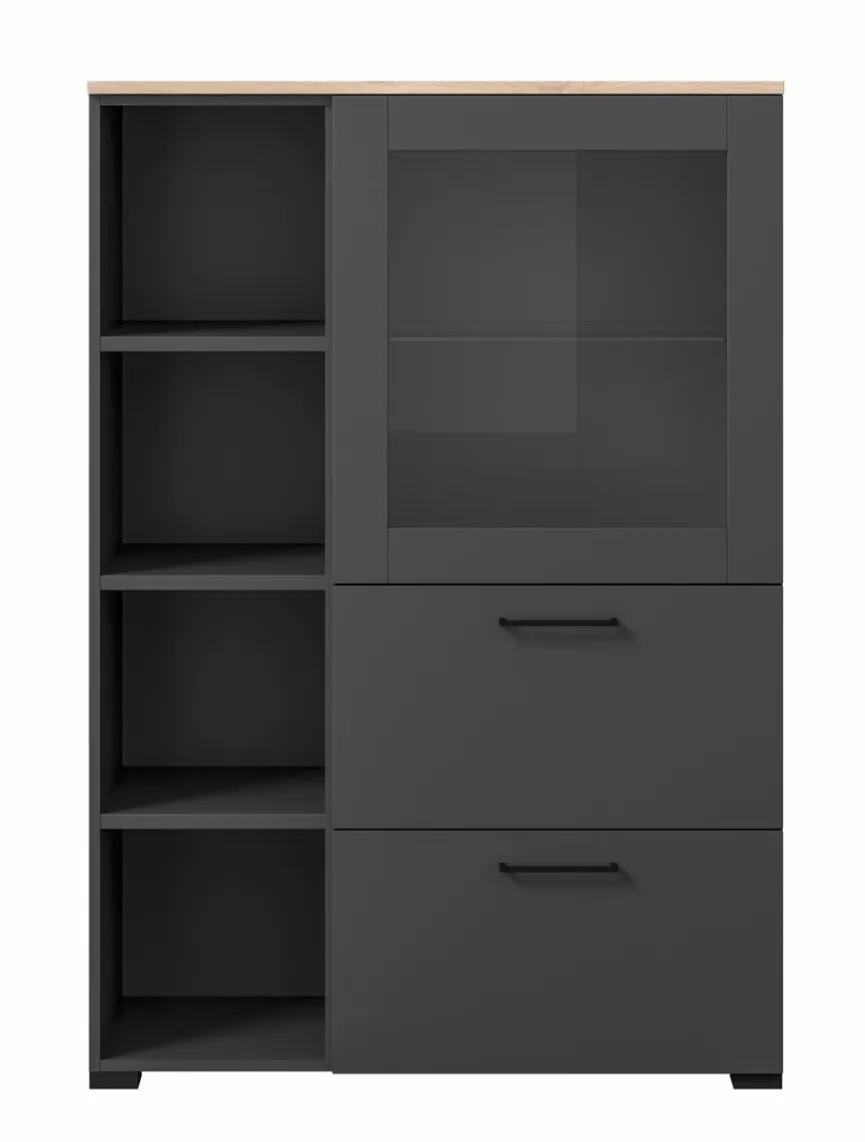 - Aus Holzwerkstoff (Spanplatte) mit kratzfester Melaminharzfolie in graphit matt, Tür und 1 Boden aus Glas, Griffe aus Metall in anthrazit