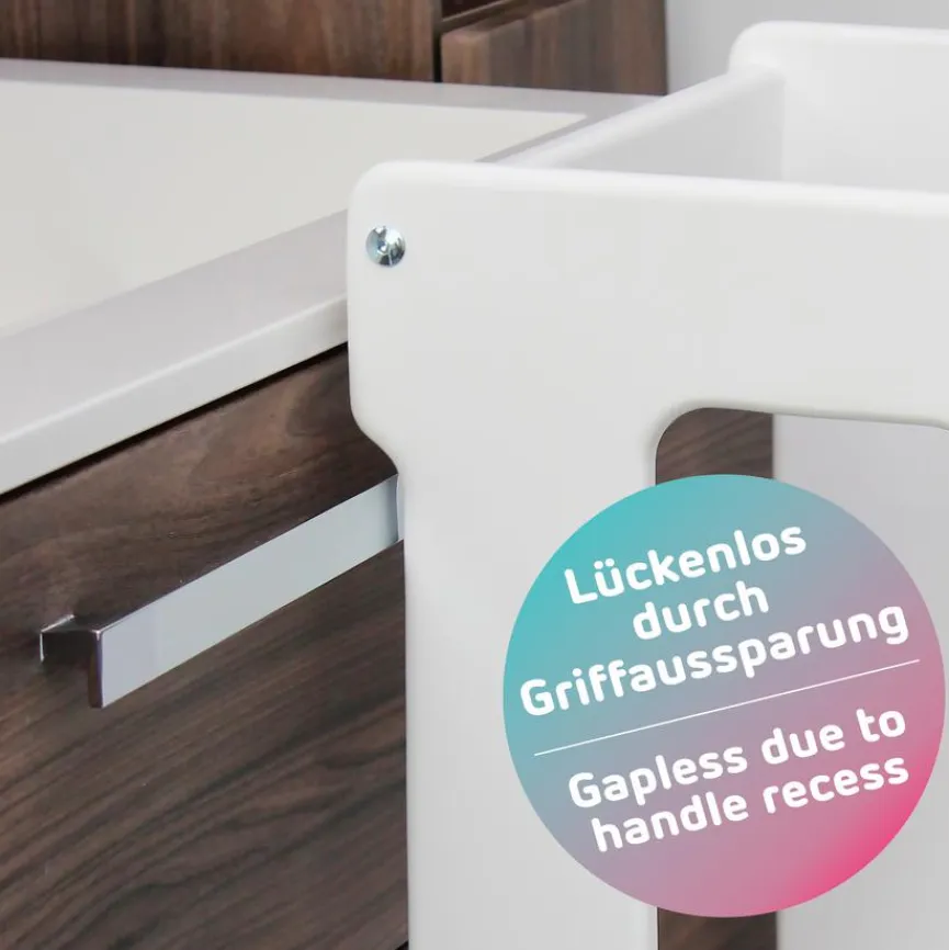 - Nahtloser Anschluss zur Küchenfront dank Griffaussparung, Leiste am Ende der Fußplatte verhindert das Durchrutschen der Füße zwischen Lernturm und Küchenfront