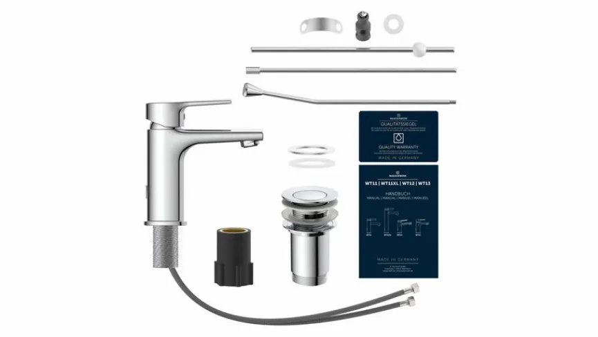 - Geräuscharme auswechselbare 35mm Keramik-Kartusche, 1 1/4 Metall-Ablaufgarnitur (4cm Durchmesser) Push-Open, extra leichte Montage durch Zentralverschraubung, Lochbohrung für Exzenter vorhanden, inkl. Zuggestänge für Clou-System