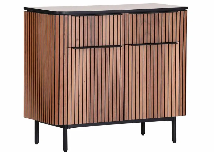 Aufgrund ihres angesagten Lammellen-Designs ist die Kommode Pannelli ein echter Hingucker im Wohnbereich, der Ihren modernen Einrichtungsstil gekonnt unterstreicht. Jedoch sieht das Möbelstück nicht nur stylisch aus, sondern es sorgt auch dank seiner cleveren Innenausstattung für eine aufgeräumte Atmosphäre. So bietet die Kommode Pannelli einen durchgehenden Einlegeboden hinter den Türen sowie 2 praktische Schubladen, wo Sie Ihre Utensilien unterbringen können.