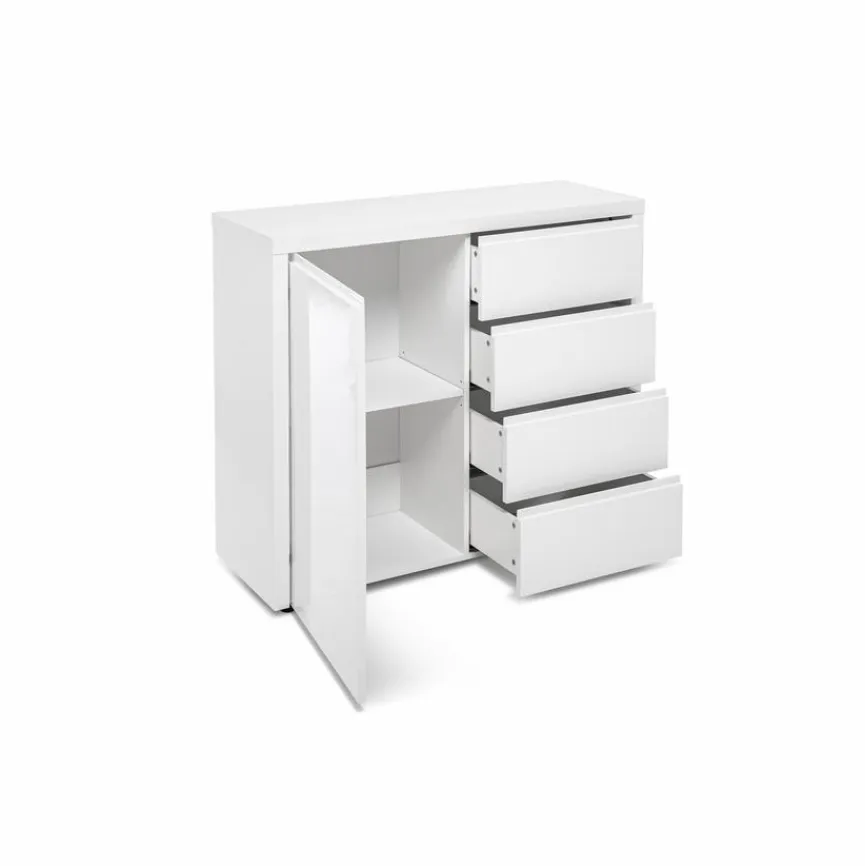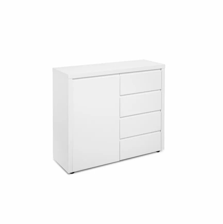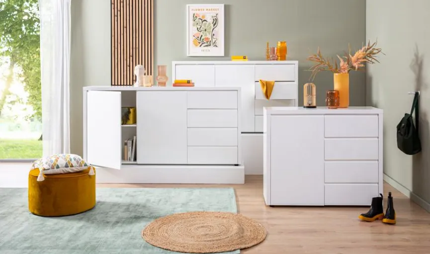 Mit der Kommode Oslo verleihen Sie Ihren Wohnräumen ein trendbewusstes Flair, denn das schnörkellose Design mit dem seidenmatten Finish trifft den Nerv der Zeit. Ausgestattet ist sie mit vier Schubkästen sowie zwei großen Fächern, die viel Stauraum bieten und gleichzeitig für mehr Ordnung sorgen. Auf der Deckplatte der Kommode Oslo finden außerdem Lampen, Pflanzen und Dekorationselemente einen festen Platz.