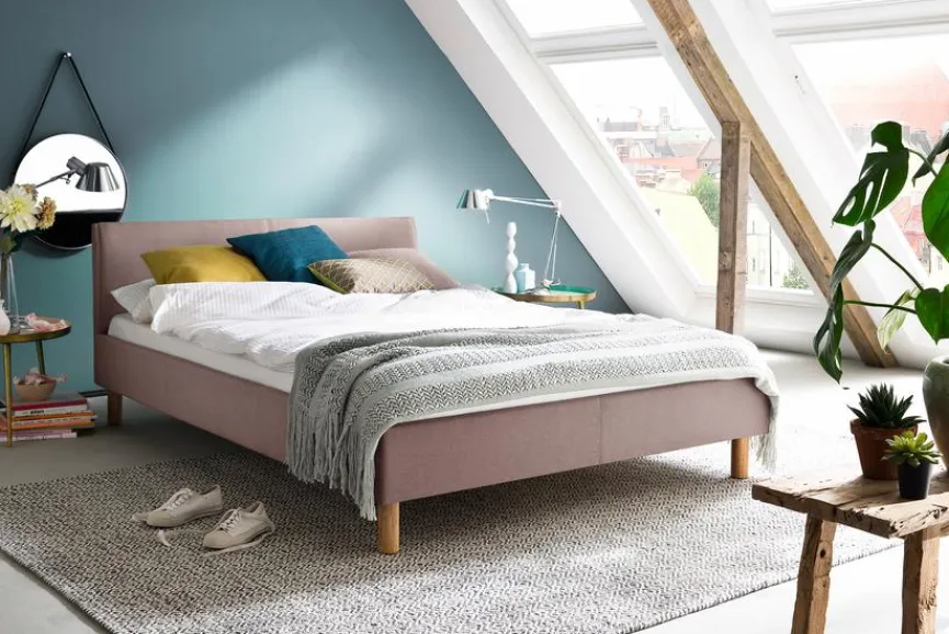 - Bettgestell aus Spanplatte, Füße aus massiver Eiche , Bezug aus 100 % Polyester in altrosa