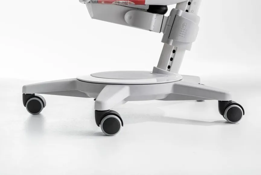 - Pendelnd gelagerte Rückenlehne, Höhe über Rastermechanik verstellbar, mit Universalrollen die für Hart- und Teppichboden geeignet sind