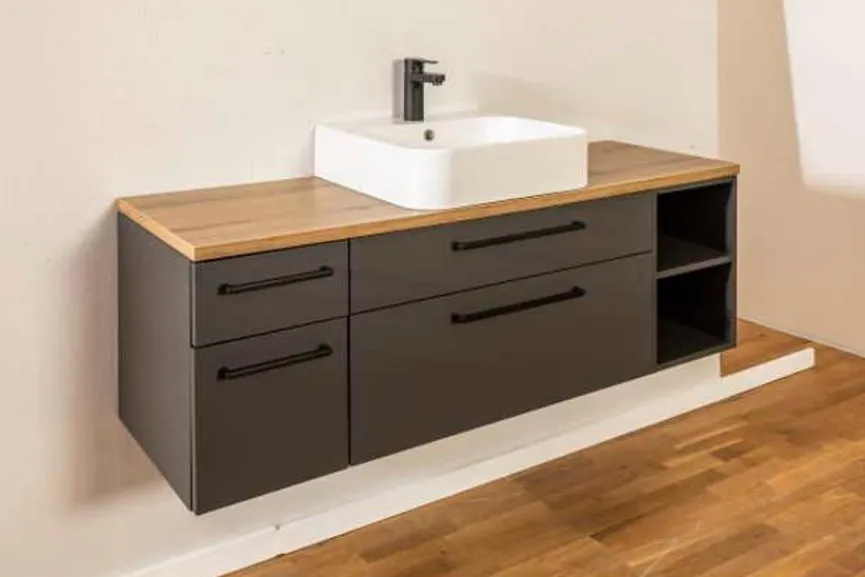- Inkl. Waschtischunterschrank B 30 cm mit 1 Schubkasten und 1 Auszug, Waschtischunterschrank B 80 cm mit 2 Schubkästen mit Holzrückwand, 1 Siphonausschnitt und 1 Kosmetikeinsatz
