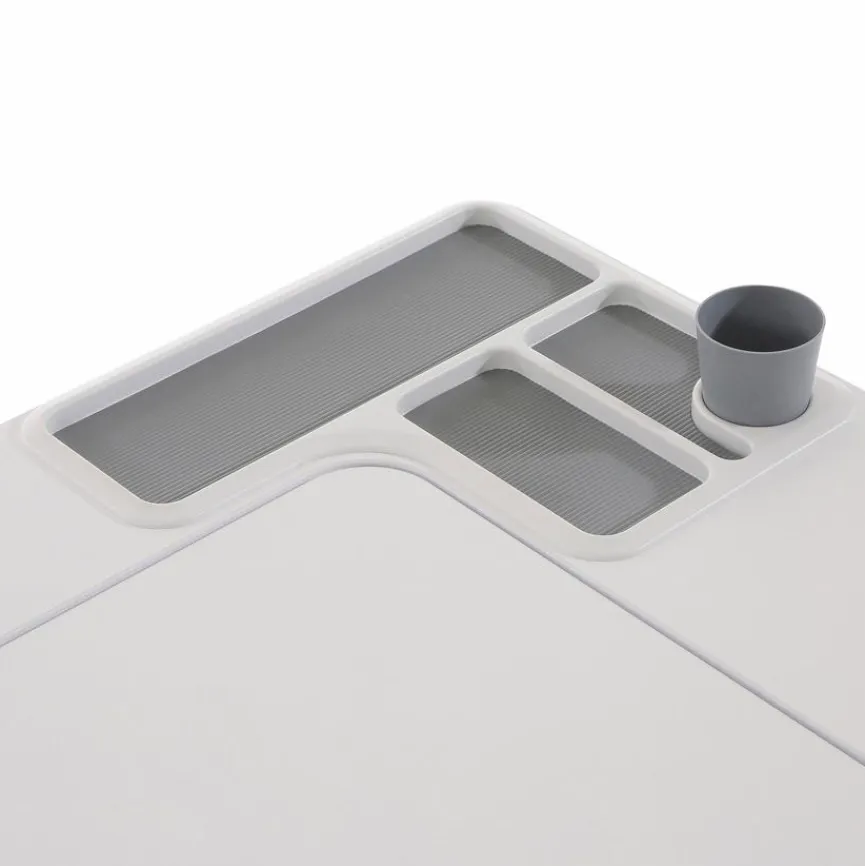 - Tischplatte geteilt, inkl. Stiftebecher und dreiteiliger Utensilienschale,