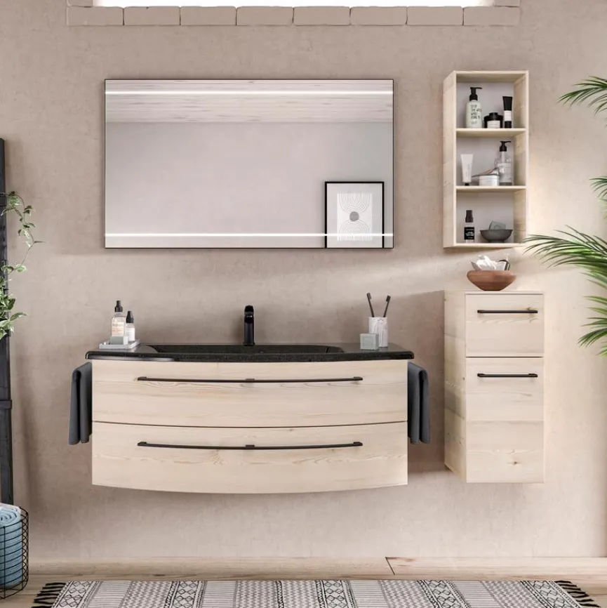 Mit seinem schlichten und klassischen Design passt sich der Unterschrank PE 7005 von Pelipal problemlos in jede Umgebung ein. Die schmalen Griffe aus Metall stellen einen schönen Kontrast zur rustikalen Holzoptik dar. Im Inneren bietet der Unterschrank PE 7005 ausreichend Platz, um alle benötigten Utensilien zu verstauen.