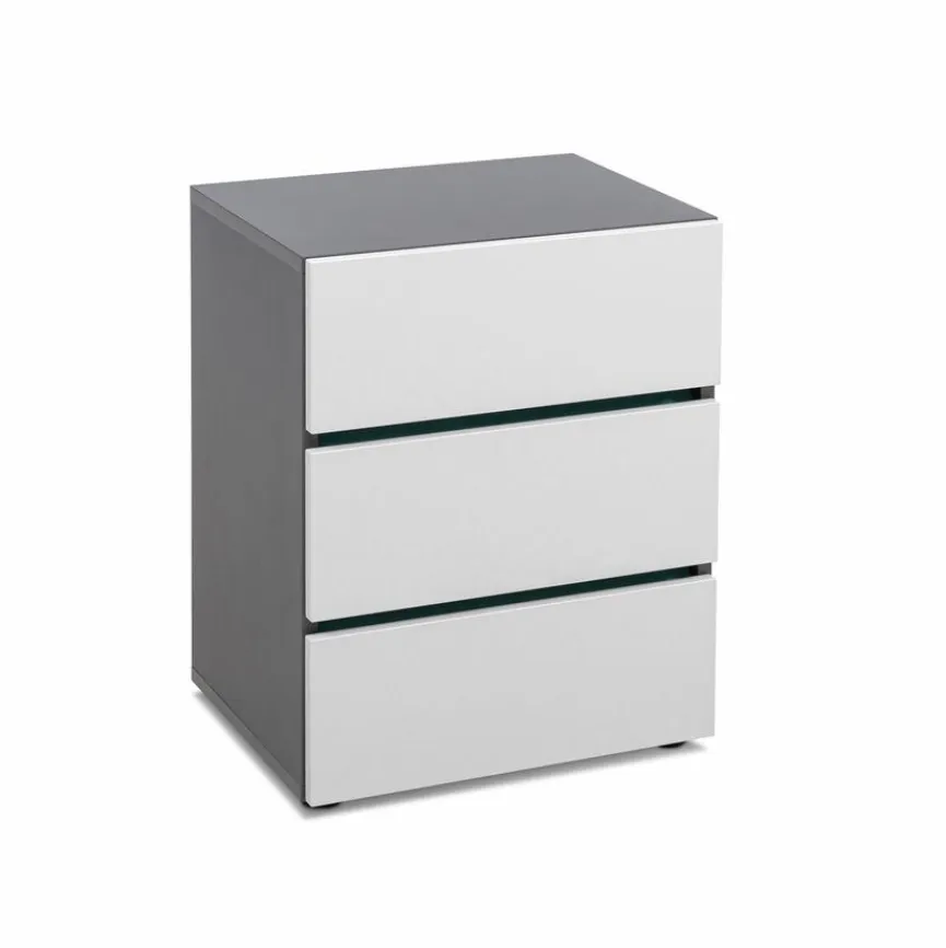 - Korpus aus Holzwerkstoff (Spanpatte) mit kratzfester Melaminharzfolie in Schiefergrau, Front aus Holzwerkstoff (Spanpatte) mit kratzfester Melaminharzfolie in Hellgrau, Absetzung aus Holzwerkstoff (Spanplatte) mit Lack in Türkis