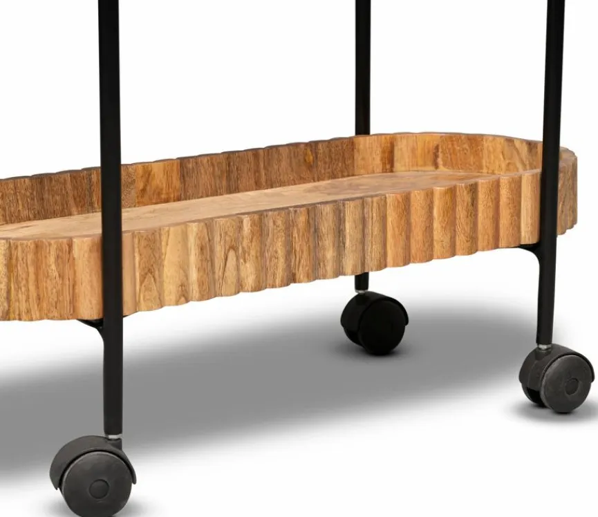 Der Servierwagen Jason kombiniert modernes Design mit natürlichen Materialien. Die obere Ablage aus getöntem Glas verleiht ihm eine elegante Note, während die untere Ablage aus massivem Holz für rustikalen Charme sorgt. Seine Stabilität erhält er durch das robuste Metallgestell. Der Servierwagen Jason eignet sich perfekt für stilvolle Getränkepräsentationen oder als dekorativer Beistelltisch.