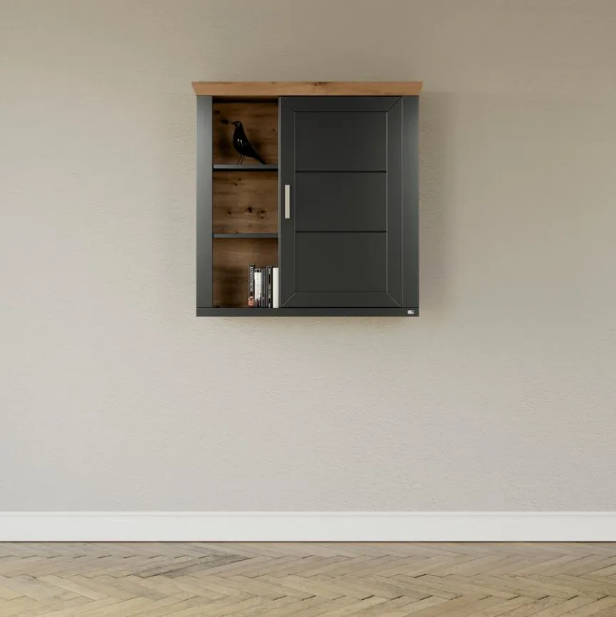 - Front aus Holzwerkstoff (MDF) in Graphit, Korpus aus Spanplatte mit kratzfester Melaminharzfolie in Graphit, Absetzung in Artisan Eiche Dekor