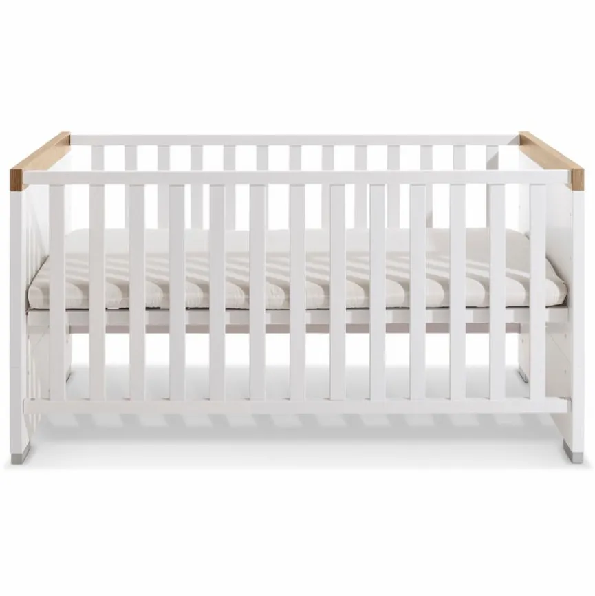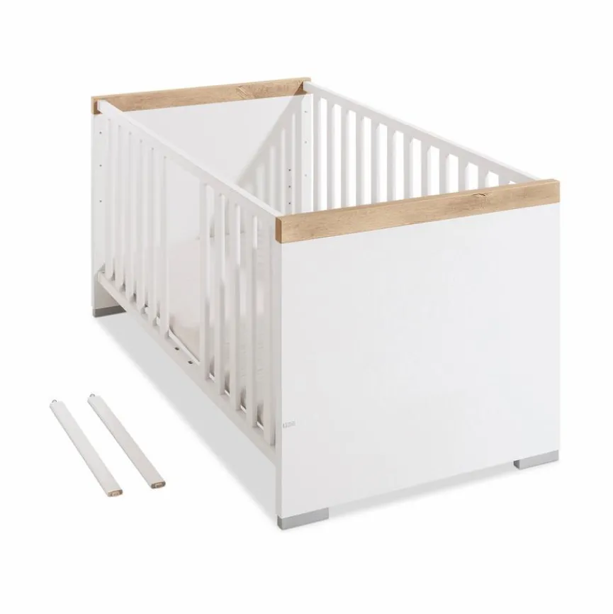 - Aus Spanplatte mit kratzfester Melaminharzfolie in Kreideweiß, Gitterbettseiten aus massiver Buche in weiß lackiert, Absetzung in Eiche Nebraska