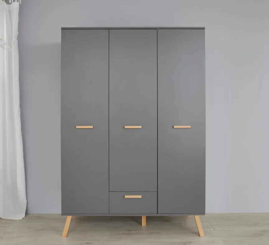 - Kleiderschrank mit 3 Türen, 4 schmalen und 1 breiten Einlegeboden, 2 Kleiderstangen und 1 Schubkasten