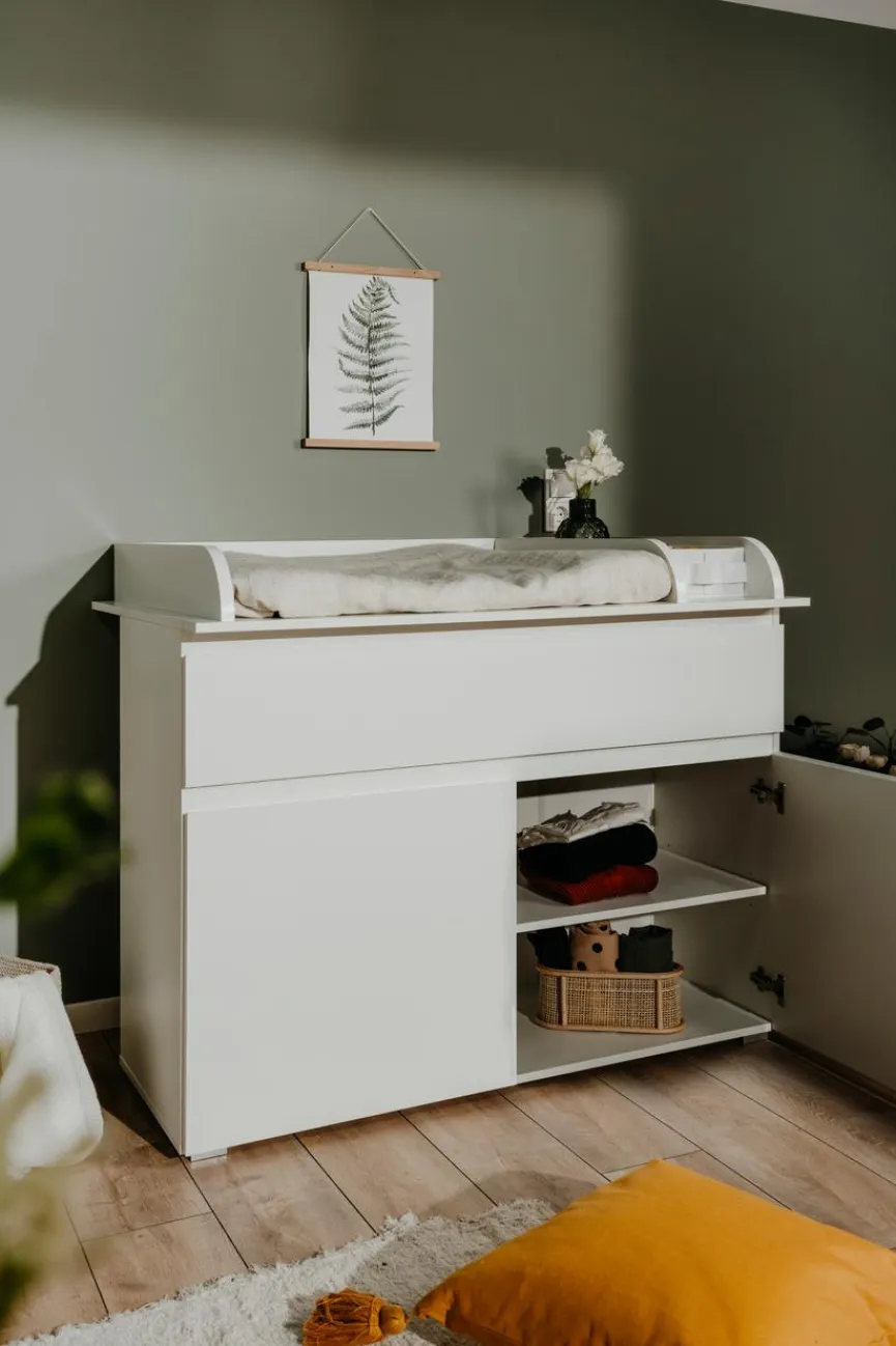 Erweitern Sie das Kinderzimmer um die Wickelkommode Image, die eine gelungene Verbindung von Stil und Funktionalität ist. Ihr zeitloses Design macht sie zu einem wertvollen Möbelstück in jeder Einrichtung. Der Wickeltisch bietet ausreichend Stauraum hinter seinen Türen und in einer geräumigen Schublade. Wählen Sie den platzsparenden Komfort der Wickelkommode Image, der Sie und Ihr Baby von der Kindheit an bis ins Erwachsenenalter begleitet.