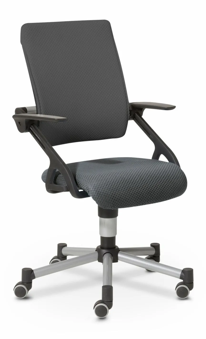 - Bezug aus Stoff in grau, Gestell/Fußkreuz aus Kunststoff in silbergrau, Armlehnen aus Kunststoff in schwarz