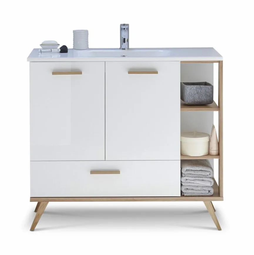 Der Mix aus einem offenen, mit Regalfächern versehenen Eckbereich und den minimalistisch designten Fronten der Türen beziehungsweise des Auszugs lässt den Waschtischunterschrank Quick 923 von Pelipal modern und aufgelockert erscheinen. Zudem sorgen kontrastreiche Absetzungen für einen wohnlichen Charme beim Waschtischunterschrank Quick 923 aus dem Hause Pelipal.