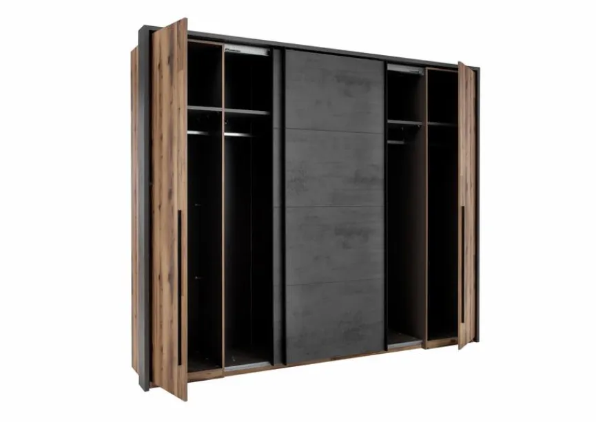 - Mit 2 Schwebetüren, 2 Außendrehtüren, 3 Mittelseiten, je 1 Fachboden und 1 Kleiderstange