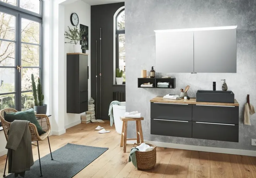 Der Spiegelschrank Aspekt von Puris ist ein eleganter Blickfang und komfortabler Helfer für das Badezimmer. Seine Doppeltüren sind mit praktischen Spiegeln versehen. Im Inneren gefällt der schicke Spiegelschrank Aspekt aus dem Hause Puris mit seinen Glasfachböden, die viel Platz für Utensilien bieten.