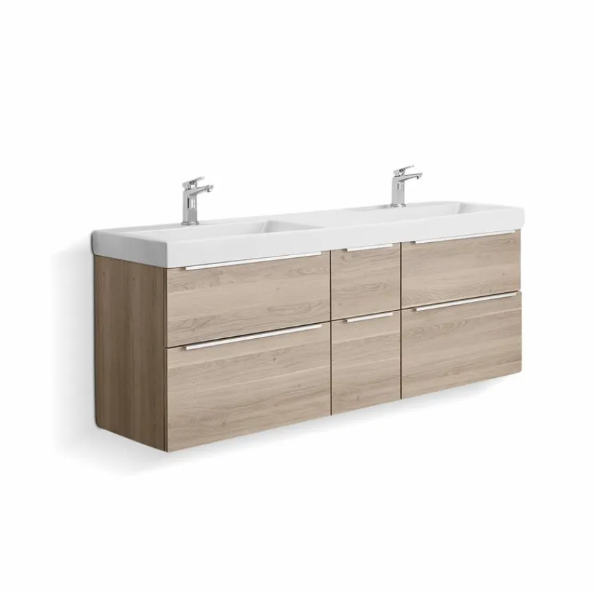 - Inkl. Keramik-Doppelwaschtisch q!flat in weiß, inkl. 2x Clou Ab- und Überlaufsystem (Clou-Abdeckung in weiß)