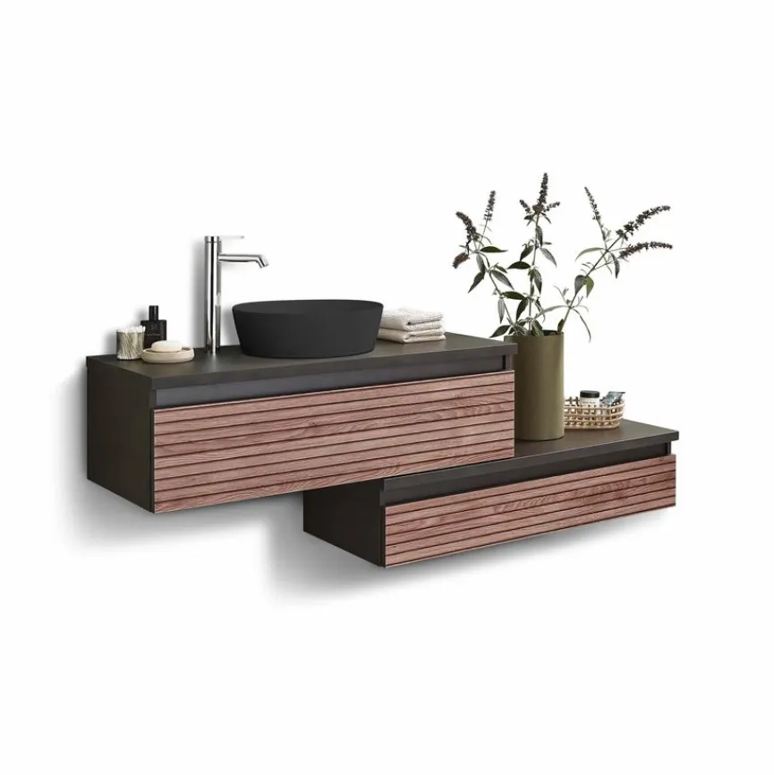 - Bestehend aus Waschtischunterschrank, 1 Metallauszug mit Siphonausschnitt mittig, 1 Waschtischplatte in Cosmos Grey matt, 100,8 cm breit, 1 Ausschnitt für Waschtischplatte