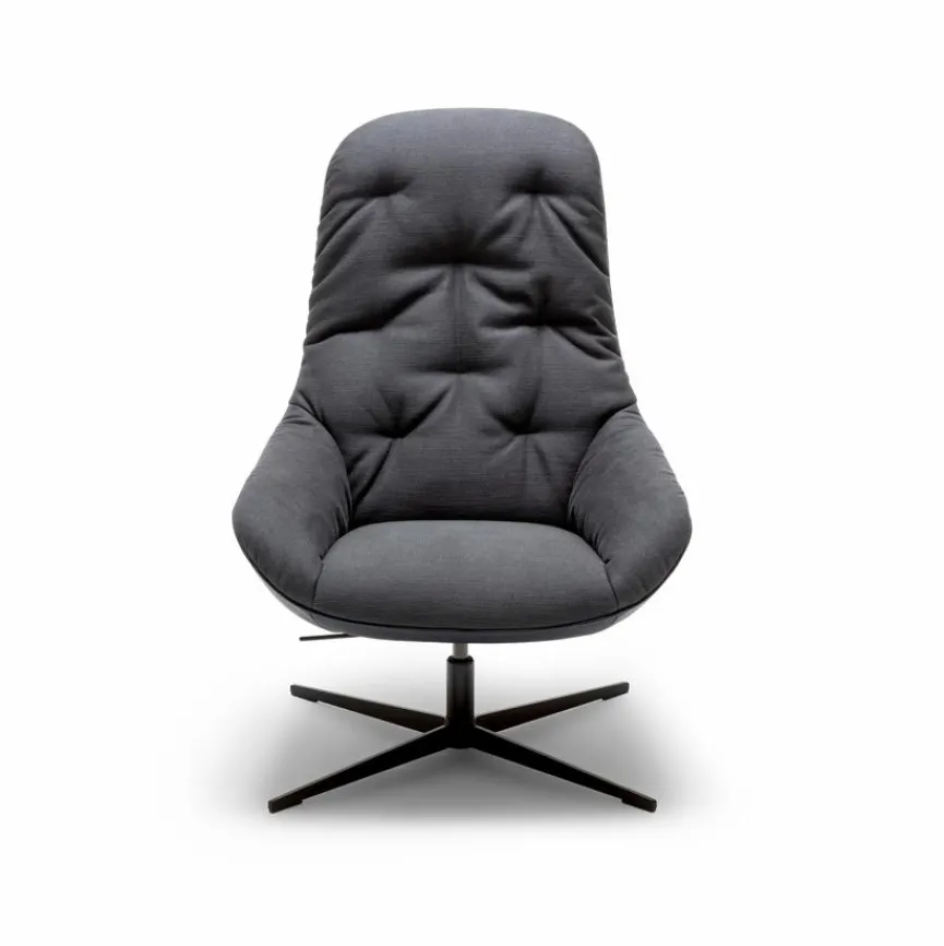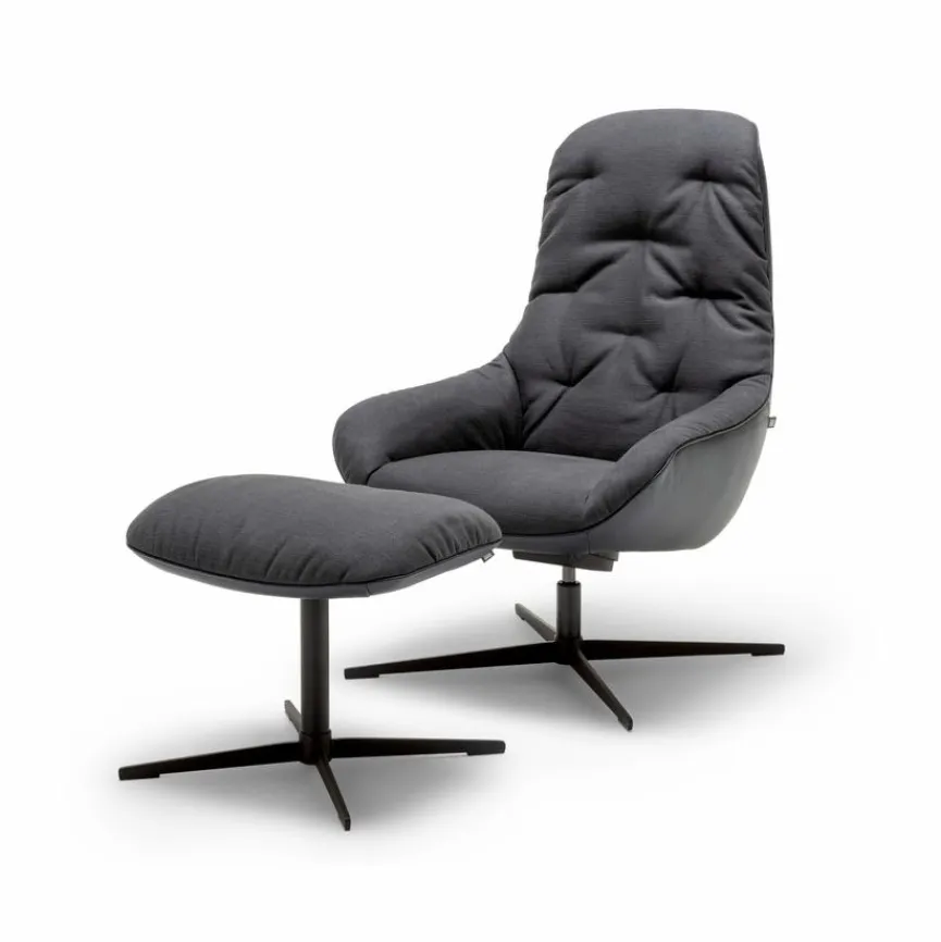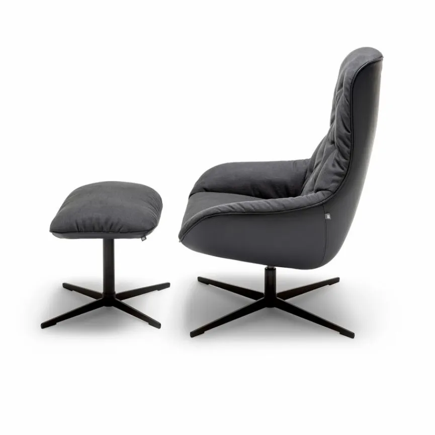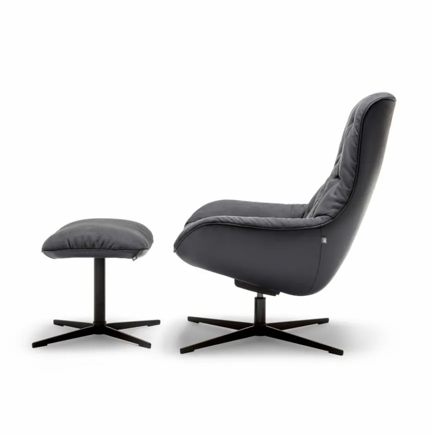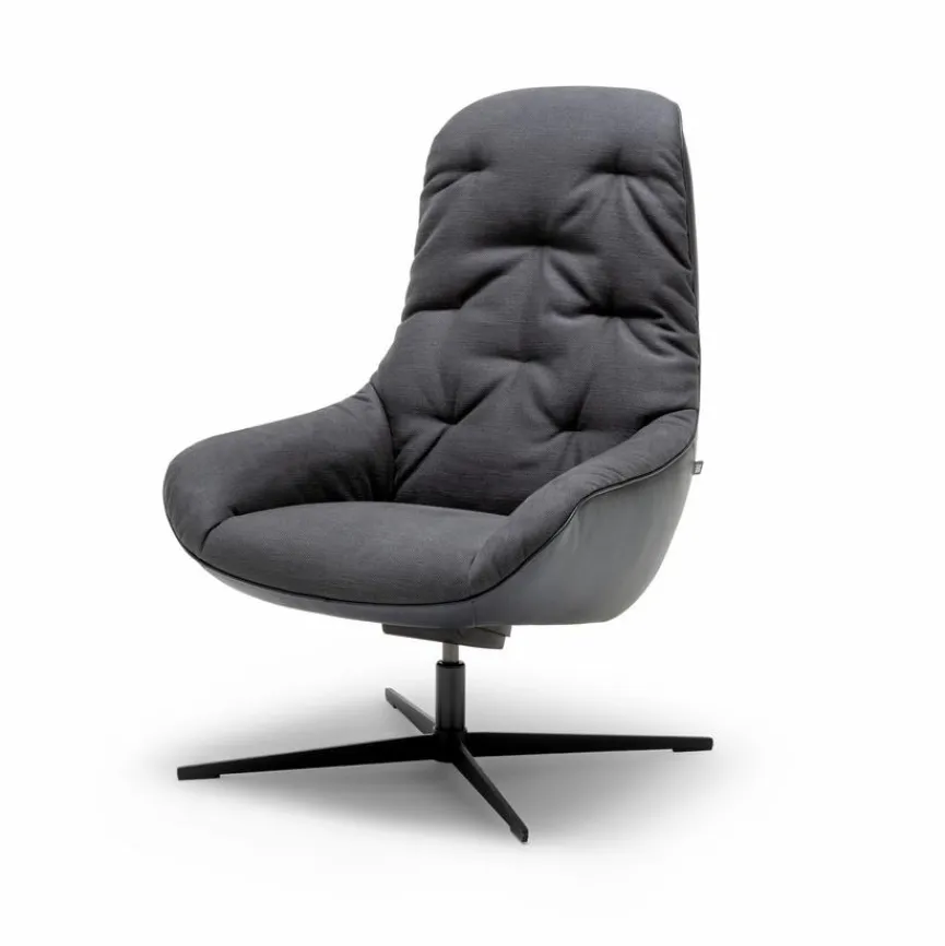 - Sitzbezug aus Stoff in schwarzgrau (17.353), Korpusbezug aus Leder in graublau (38.109), Kreuzfuß pulverbeschichtet in RAL9017 verkehrsschwarz
