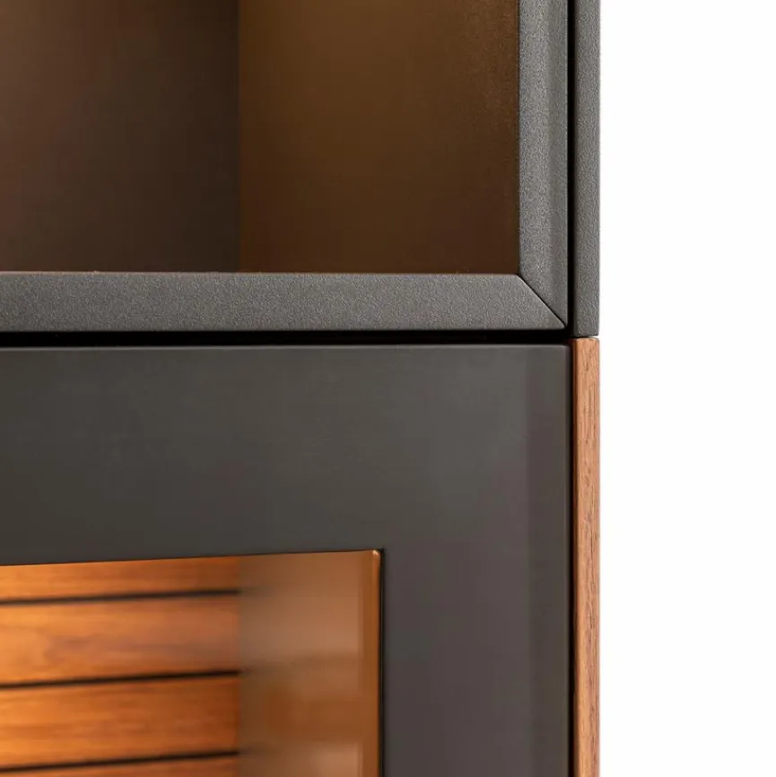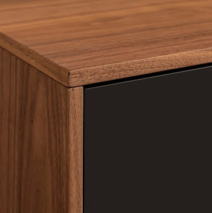 - Aus Holzwerkstoff mit Lack in anthrazit, Absetzungen aus Holzwerkstoff mit Echtholzfurnier in Nussbaum, untere Abdeckplatte des TV-Lowboards mit Echtholzfurnier in Nussbaum, Hängeelement mit Lamellenrückwand