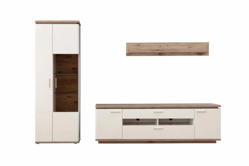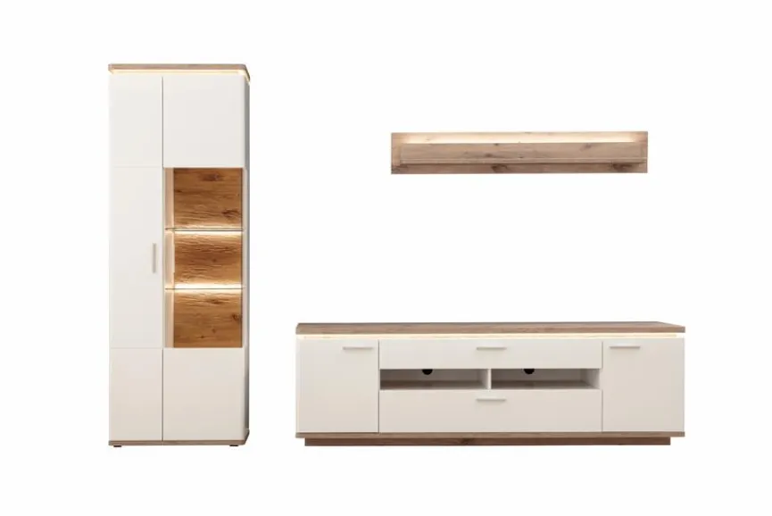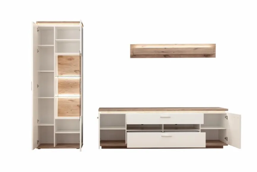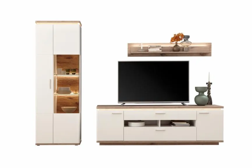 - Bestehend aus Vitrine, TV-Lowboard und Wandboard
