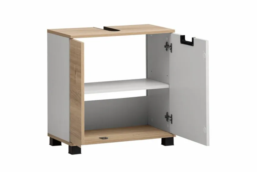 - Front und Korpus aus Holzwerkstoff (Spanplatte) mit kratzfester Melaminharzfolie in Weiß und Akzente in Eiche hell