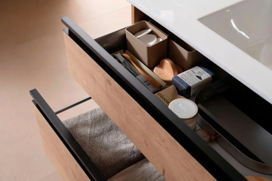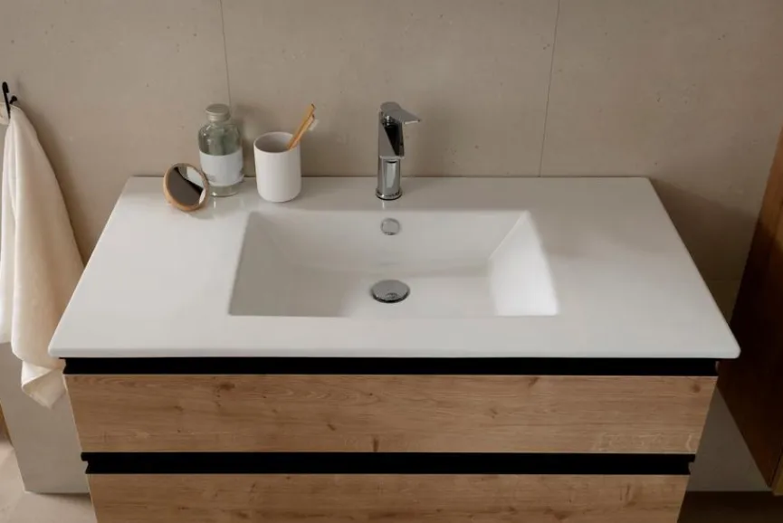 - Bestehend aus Waschtischunterschrank mit 2 Metallschubkästen mit Einzugsdämpfung, Keramik-Waschtisch in Weiß mit integriertem Überlauf