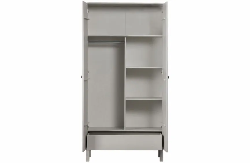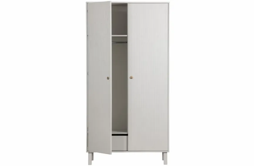 Der Schrank Madu ist mit zwei Türen ausgestattet, dahinter befinden sich vier Einlegeböden, eine geräumige Schublade und ein Hängeteil. Socken, Unterwäsche, Modeaccessoires und Co. können in diesem Kleiderschrank problemlos aufbewahrt werden. Zudem lässt sich der Schrank Madu aufgrund seiner zeitlosen Optik bestens in viele unterschiedliche Wohnstile integrieren.