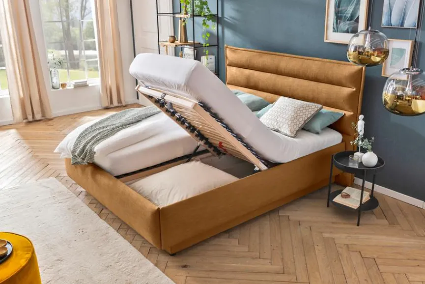 Bettkästen werden mit komplett gelochter Bodenplatte – zur besseren Bettkastenbelüftung – gefertigt; durch den stoffbezogenen Sockel wird der Stauraum im Bettkasten größer