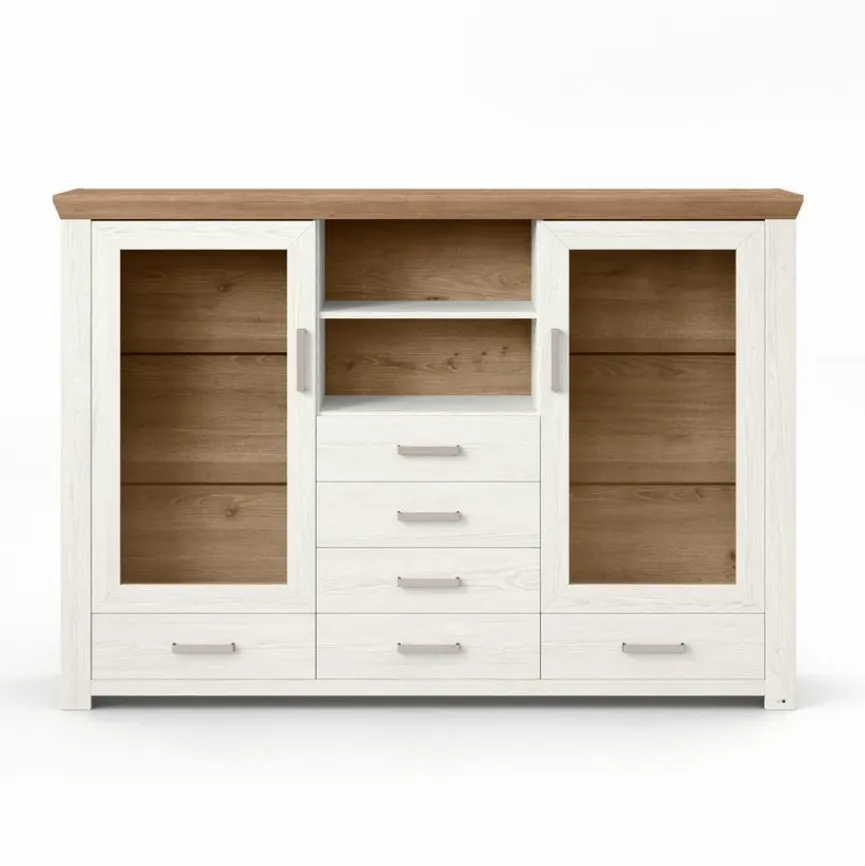 Das Highboard York von set one by Musterring setzt gemütliche Akzente im modernen Landhausstil. Ein markantes, farblich abgesetztes Kranzprofil verhilft der Kommode zu ihrem klassischen Touch. Ergänzen Sie das geräumige Highboard York am besten mit weiteren Möbeltypen aus diesem charmanten und sehr freundlich wirkenden Programm!