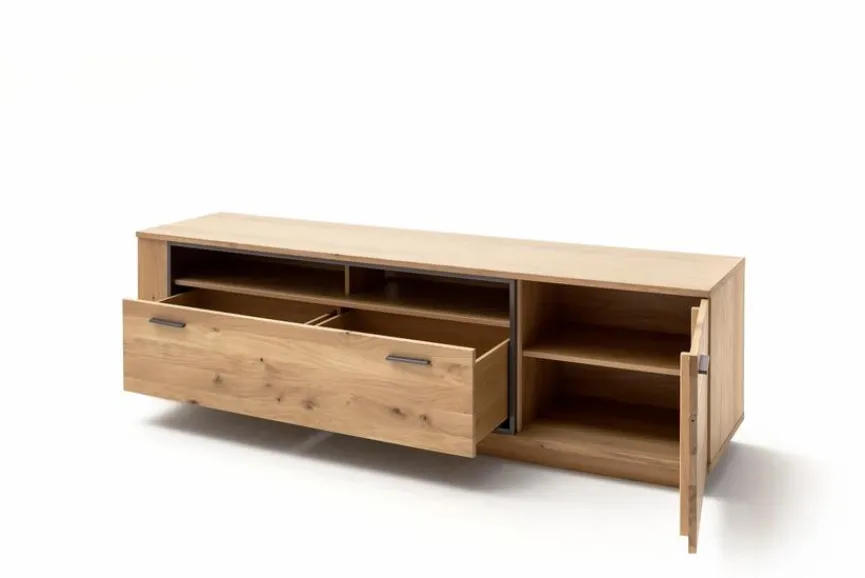 Das TV-Lowboard Campinas verfügt über offene Fächer, in denen Sie beispielsweise Spielkonsolen oder DVD-Player verstauen können. Durch die Öffnung in der Rückwand des TV-Unterschranks führen Sie problemlos die Kabel aller Geräte. Darüber hinaus umfasst das TV-Lowboard Campinas eine Schublade und eine Drehtür, die sich aufgrund des integrierten Dämpfungssystems bequem öffnen und schließen lassen.