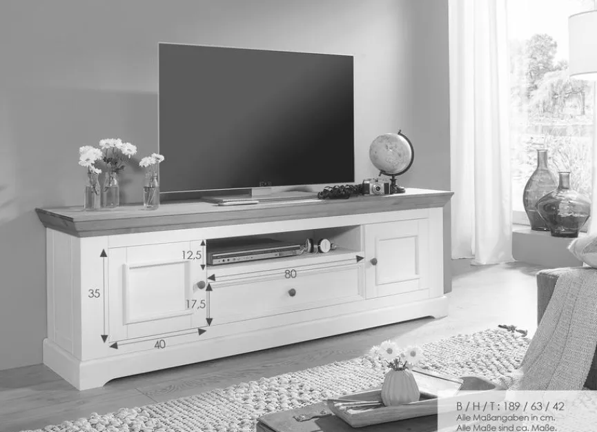 Das TV-Lowboard Minnesota präsentiert sich in einem schicken Design im Landhaus-Stil. Die Optik wird durch die geschmackvolle Formgebung und die farblich abgesetzte Abdeckplatte bestimmt. Darüber hinaus bietet das TV-Lowboard in vielen verschiedenen Fächern ausreichend Stauraum für die Aufbewahrung diverser Gegenstände.