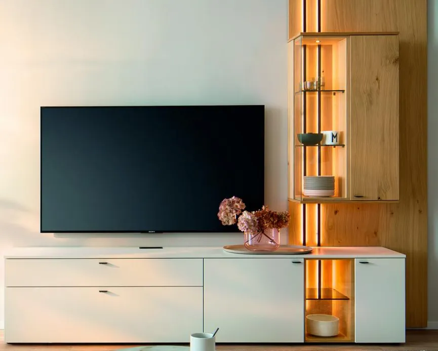 - Bestehend aus TV-Lowboard, Wandpaneel und Hängevitrine