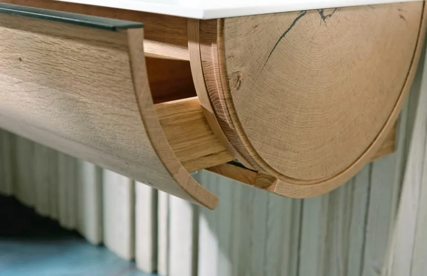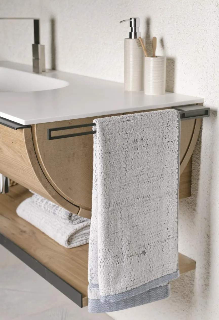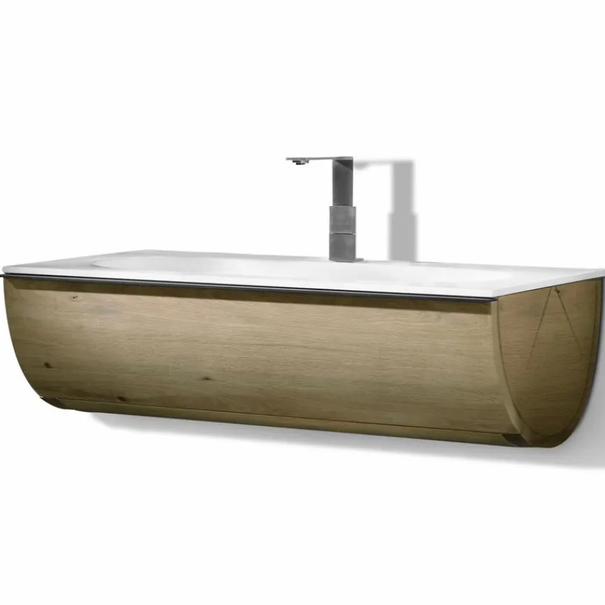 - Mit Waschtischunterschrank mit 1 Schublade, gezinkte Massivholzladen (Eiche) mit verdecktem, leichtgängigem Vollauszug