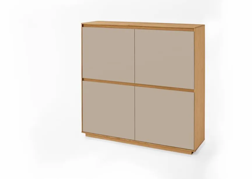 Die Kommode V100 aus dem Hause Voss Möbel überzeugt optisch mit ihrem dezenten Design. Sie hat darüber hinaus vier Türen, einen festen Konstruktionsboden, eine Mittelseite sowie acht verstellbare Einlegeböden. So bietet die Kommode V100 der Marke Voss Möbel für bis zu 36 Paar Schuhe Platz.