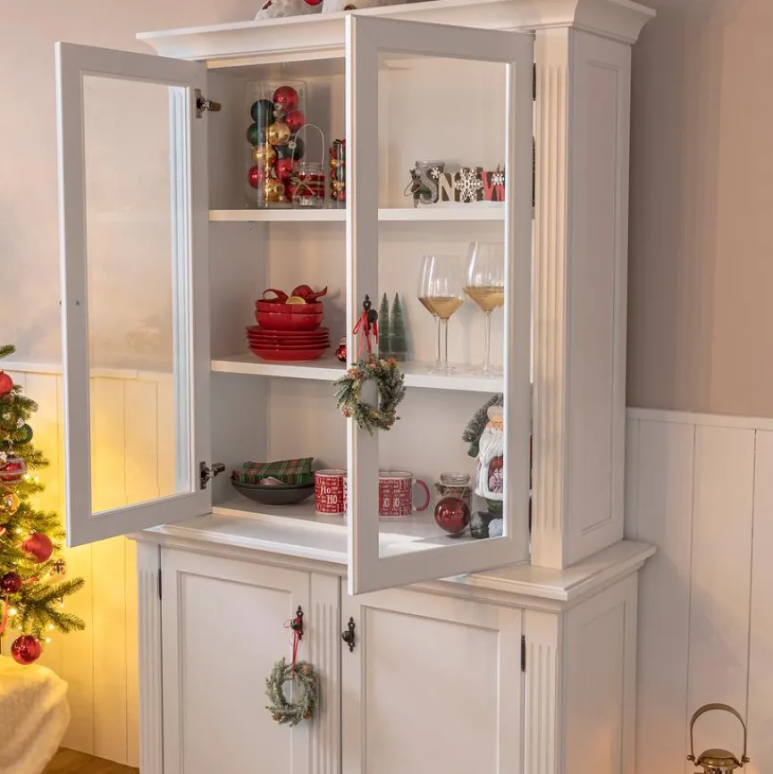 Mit dem Buffet Maisonette sichern Sie sich ein Küchenmöbel im klassischen Design, das unter anderem hervorragend zum Landhausstil passt. Der Buffetschrank wartet unter anderem mit zierenden Beschlägen und Fräsungen auf. In der Küche oder dem Esszimmer bietet das Buffet Maisonette mit seinem Vitrinenaufsatz die Möglichkeit, ein besonders hübsches Service oder Deko stilvoll zu präsentieren.