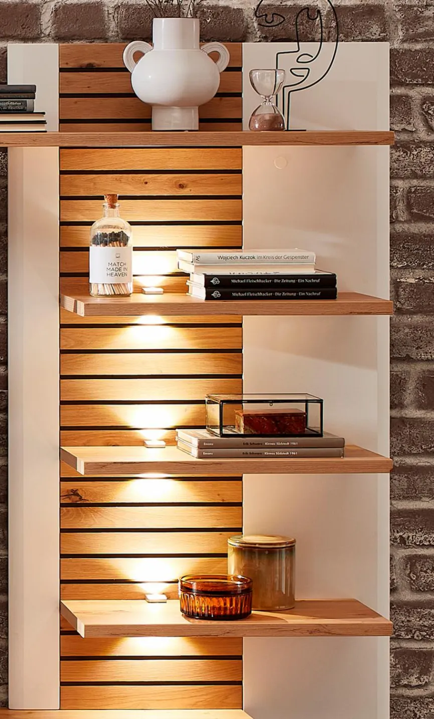 - Front aus Holzwerkstoff (MDF) in matt Weiß und Absetzung in Artisan Eiche Leistenoptik aus Holzwerkstoff (MDF)