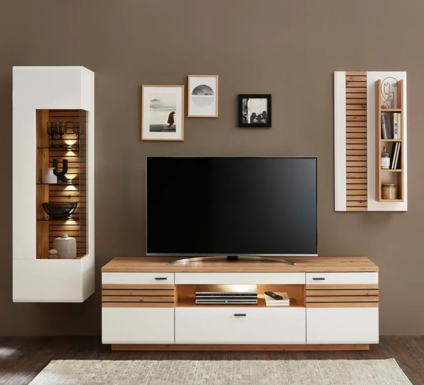 - Wohnwand bestehend aus: Hängevitrine, TV-Lowboard und Wandregal