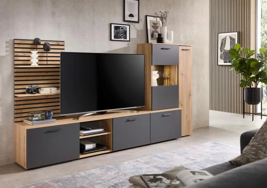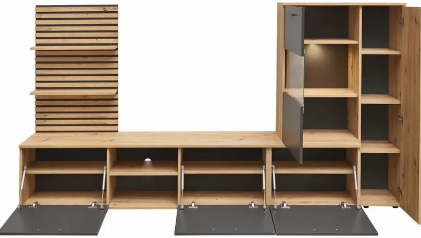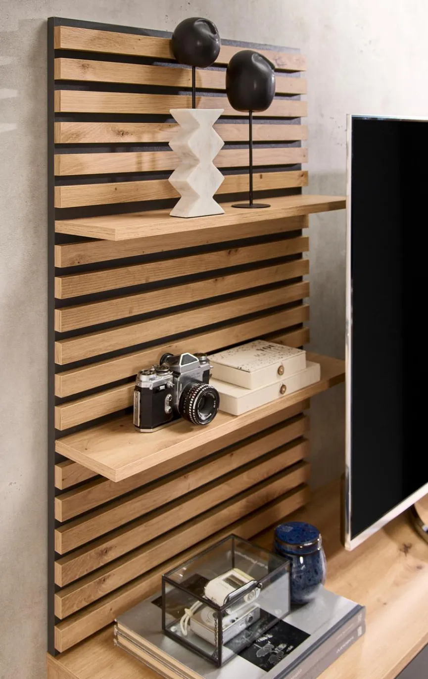 - Aus Holzwerkstoff (Spanplatte) mit kratzfester Melaminharzfolie in Artisan Eiche, Absetzung aus Holzwerkstoff (Spanplatte) mit kratzfester Melaminharzfolie in Anthrazit, Lamellen beim Wandboard aus Holzwerkstoff (MDF) in Artisan Eiche foliert