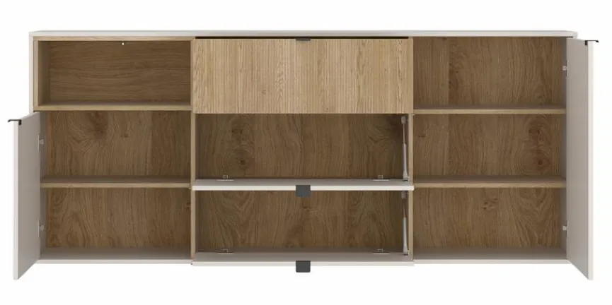 - Mit 2 Türen, 1 Schubkasten, 2 Klappen und 1 offenen Fach