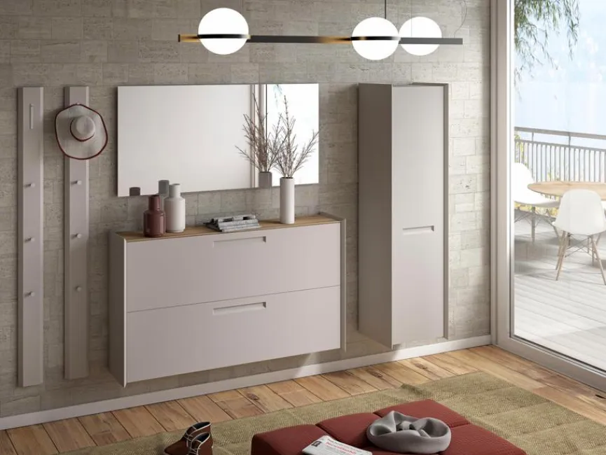 - Garderobe aus 2 Garderobenpaneelen, Hänge-Schuhschrank, Spiegel und Hänge-Mehrzweckschrank