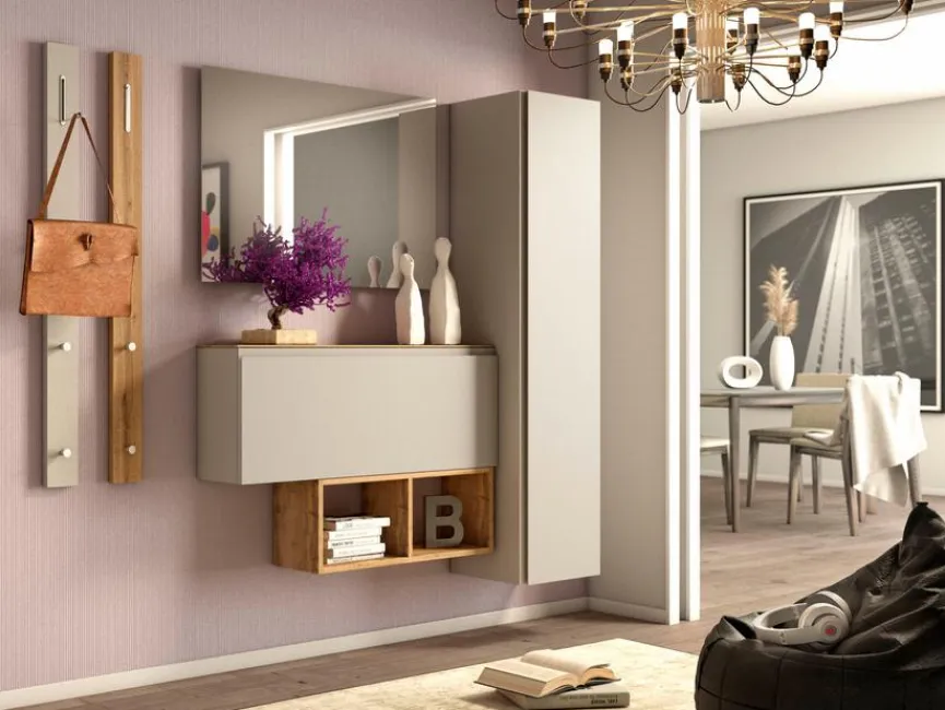 - Garderobe aus 2 Garderobenpaneelen, Regal, Hänge-Schuhschrank, Spiegel und Hänge-Mehrzweckschrank