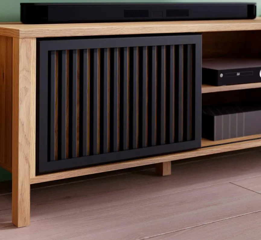- Aus Holzwerkstoff (Spanplatte) mit hochwertiger Dekorfolie in Eiche Mauvella, Absetzung in schwarz