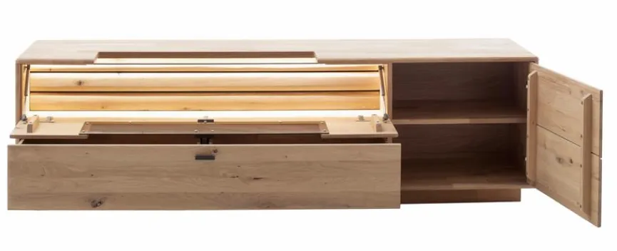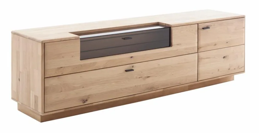 - Korpus aus Ast/Balkeneiche massiv keilgezinkt in Kristalleiche geölt, Front aus Ast/Balkeneiche massiv durchgehende Lamelle in Kristalleiche geölt