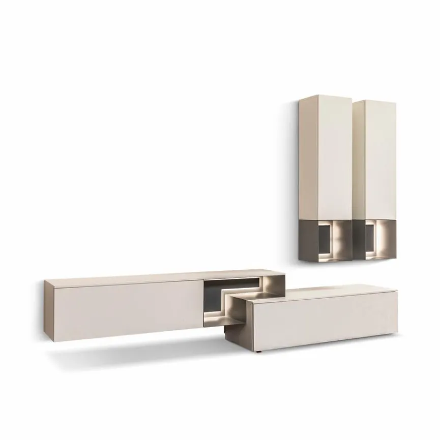 - Wohnwand bestehend aus: 1 Lowboard, 1 Hängelowboard, 2 Hängevitrinen