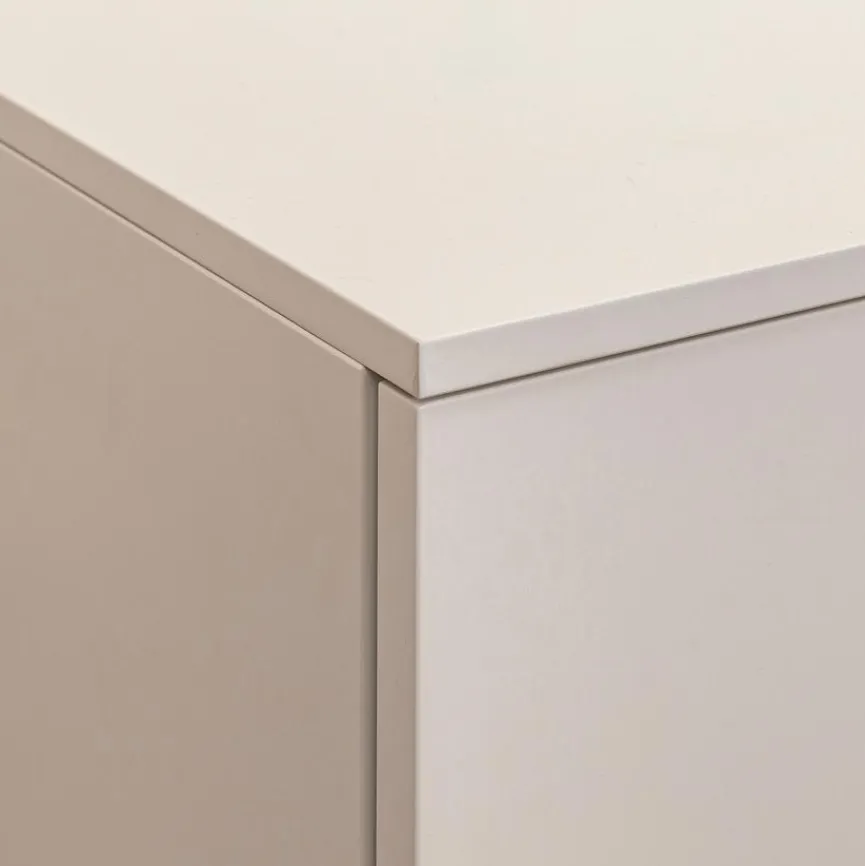 - Front und Korpus aus Holzwerkstoff (Spanplatte/MDF) in Lack matt Bianco Gesso, Absetzung in Lack pastellblau