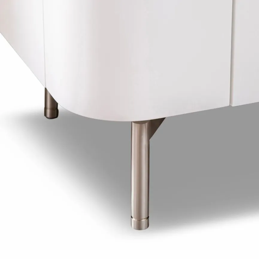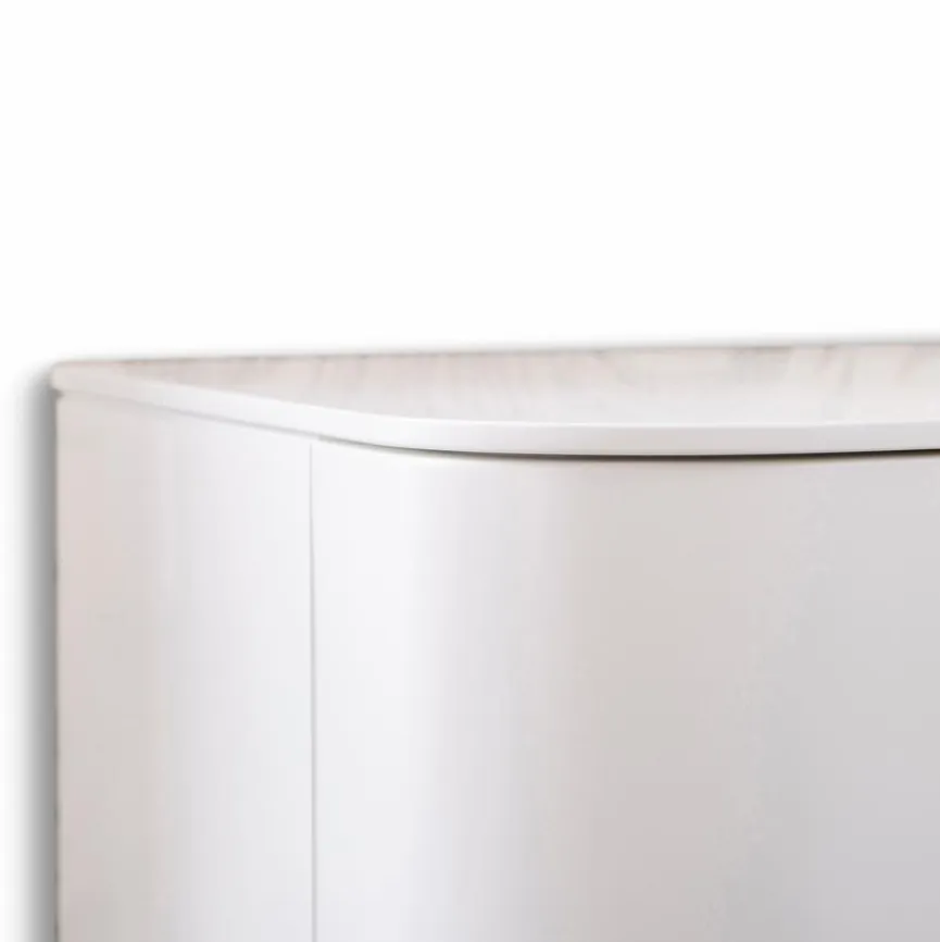 - Aus Holzwerkstoff (Spanplatte) mit Lack in Schneeweiß matt, Gerundete Front-Elemente und Abdeckplatte aus Holzwerkstoff (MDF) mit Lack in Schneeweiß matt