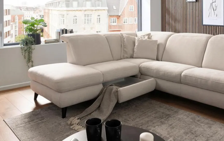 - inkl. Querschläfer echt bezogen im 2-Sitzer, Schubkasten in der Ottomane, Armteilverstellung beim 2-Sitzer und Kopfteilverstellung bei dem kompletten Ecksofa